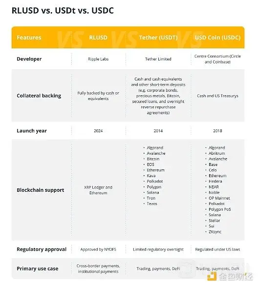 以下是 RLUSD 与 USDT 和 USDC 的不同之处: