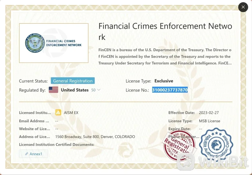 AISMEX在金融犯罪執法網絡 (fincen) 中以一般註冊狀態註冊。相關法規編號 AISMEX是31000237737870。在監管監督方面, AISMEX擁有 MSB 許可證。特定於的許可證名稱 AISMEX是 aism 前。