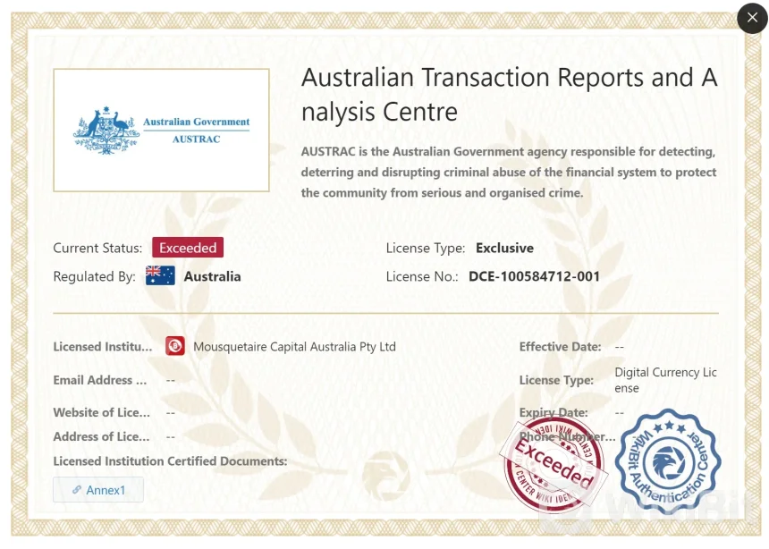 持有許可證的實體 Bitcoinwin其運營機構為“mousquetaire Capital Australia Pty Ltd”。