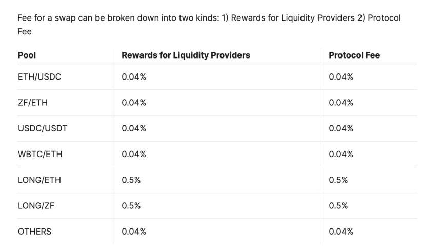 對於大多數池子,如 ETH/USDC、ZF/ETH、USDC/USDT 和 WBTC/ETH,這兩個組成部分的費用都設定為0.04%。