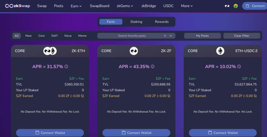 包括交換、賺取、流動性池等多種服務:zkSwap提供各種DeFi服務,如交換、流動性池和收益農場,為用戶提供多種參與和獲得平台內獎勵的方式。