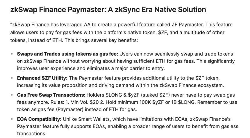 Paymaster: 此功能允許用戶使用平台的原生代幣 $ZF 和其他多種代幣支付燃氣費,而不是使用 ETH。